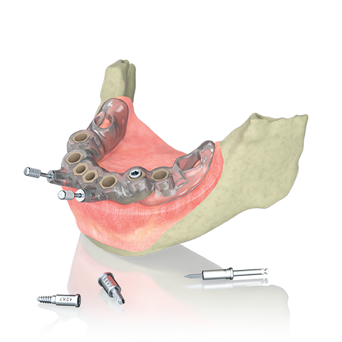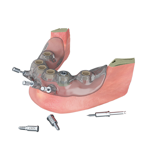If the patient has a residual dentition, the template can use it as a support to achieve stability. If you require greater stability, you should use crestal pins. The crestal pins should be inserted after using a lance drill and be chosen with a diameter that is consistent with the sleeve and the length depending on the implant to be inserted.