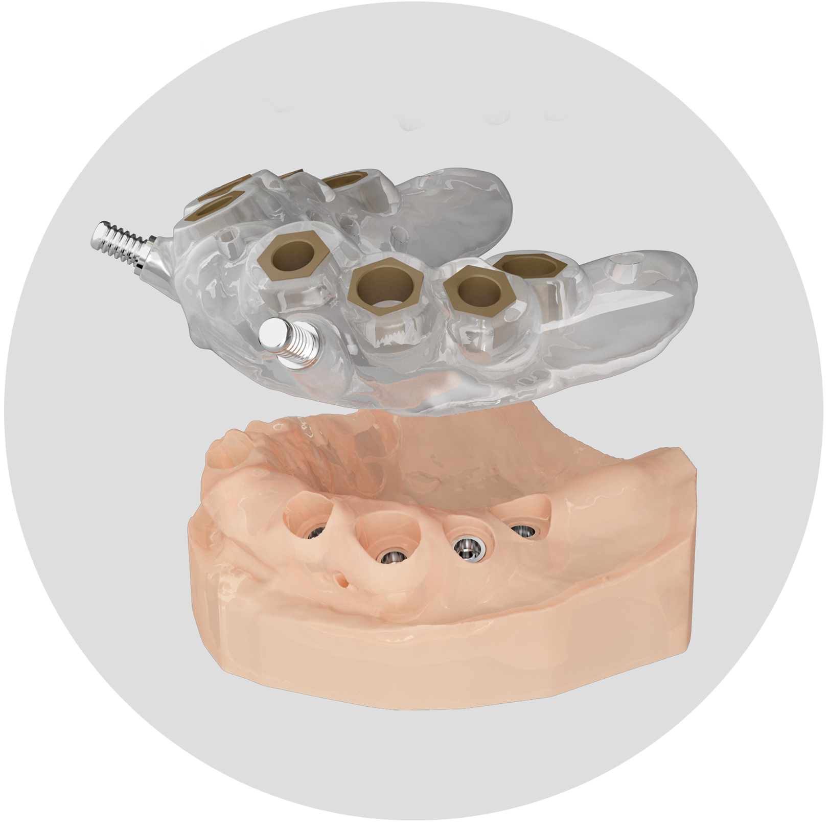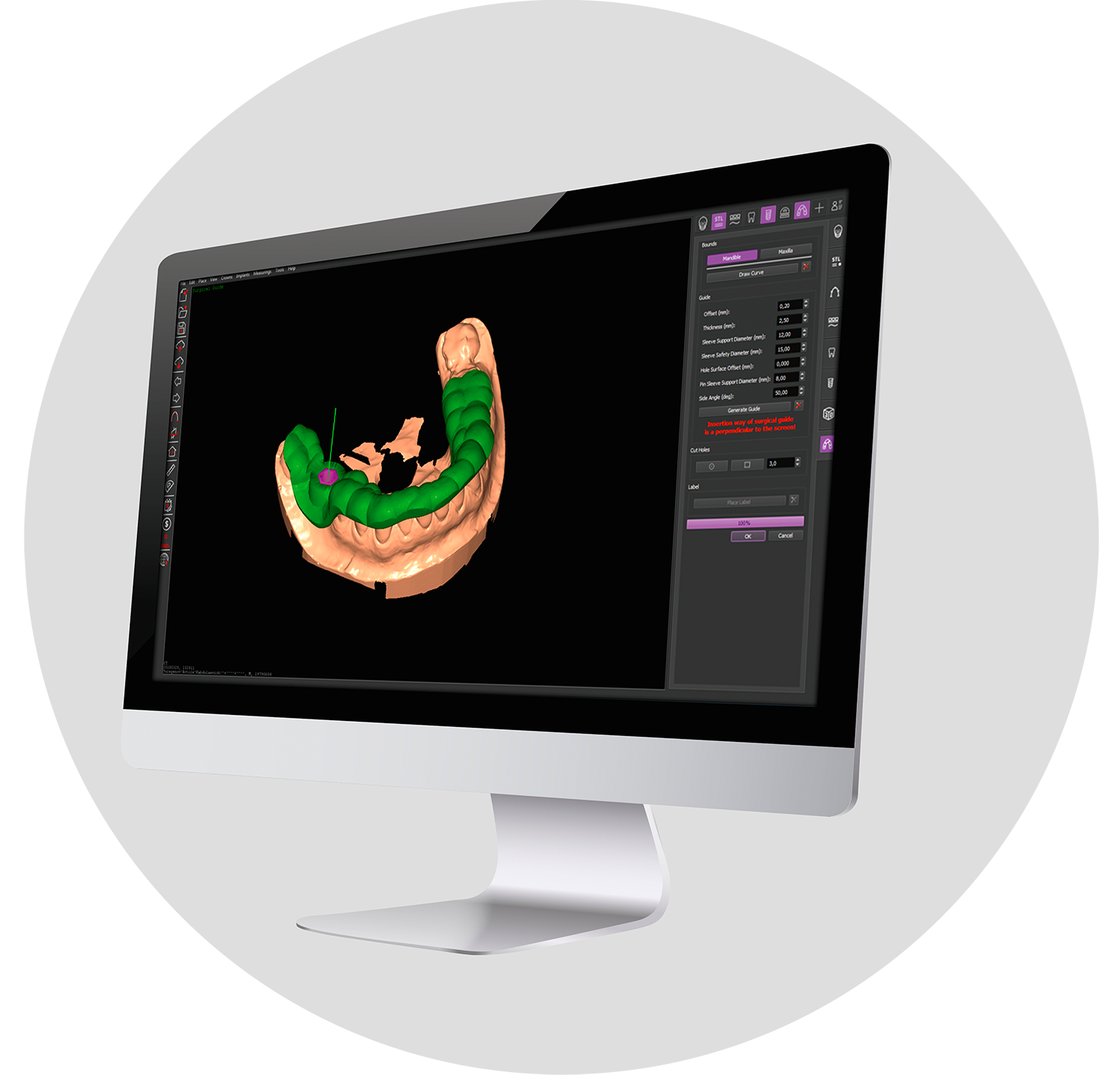 The surgical guide can be modelled using the planning or modelling software. It is important to evaluate the tolerance between sleeves and equipment parameters in order to ensure proper fit.