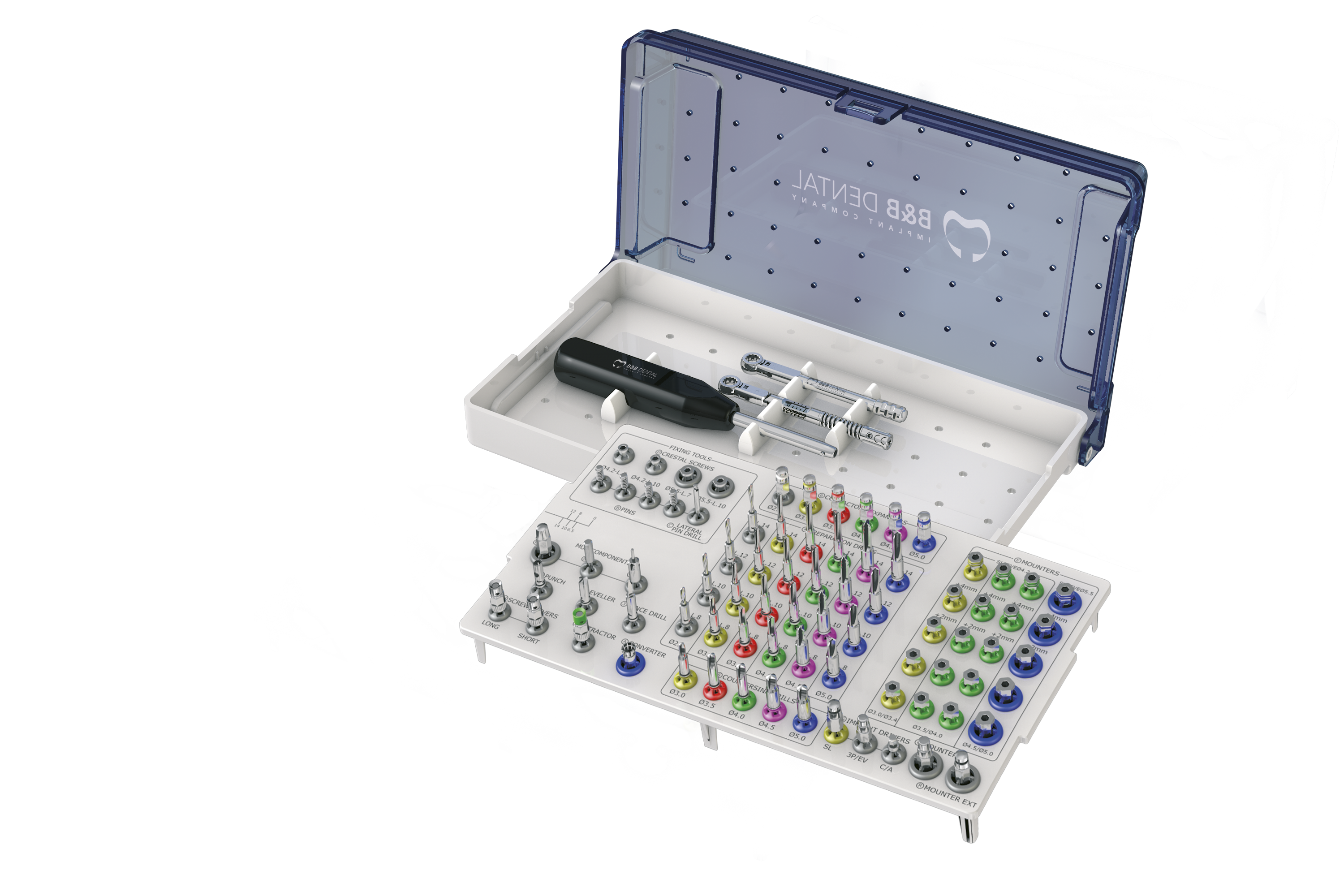 Prior to outlining the operative protocol, understanding the surgical kit's accessories is essential. B&B DENTAL SURGICAL KIT's instrument design suits guided insertion of SLIM, 3P, and EV line implants. Drill necks ensure precise insertion into guided sleeves, marking a 9 mm distance from the bone's crestal edge.